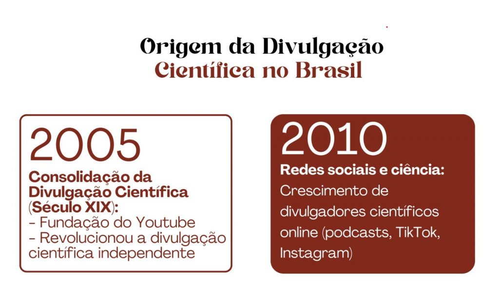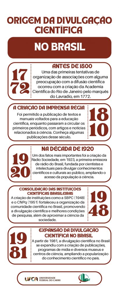Ao mergulhar numa breve contextualização sobre o surgimento da Divulgação Científica, esses autores também destacam sua trajetória no Brasil. Embora tenha sua origem na Europa, a partir do século XVI, no país as primeiras manifestações ocorreram entre os anos de 1808 e 1821, com a criação de instituições como o Museu Nacional, a Biblioteca Nacional  e o Jardim Botânico do Rio de Janeiro. Mas foi a partir da década de 1950 que a divulgação científica começou a se consolidar. Em meados da década de 1970, o Almanaque Abril contribuiu para uma renovação do gênero da divulgação científica, embora publicações com esse perfil já existissem anteriormente. Essa linha do tempo evidencia o crescimento da divulgação científica em espaços de maior acesso público, como revistas e outros meios de comunicação.