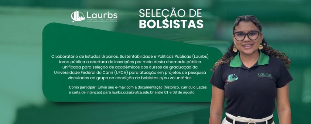 O Laboratório de Estudos Urbanos, Sustentabilidade e Políticas Públicas (LAURBS), da Universidade Federal do Cariri (UFCA), está com chamada aberta para seleção de estudantes interessados em participar de projetos de iniciação científica com bolsa remunerada. A iniciativa contempla duas linhas de pesquisa voltadas para temáticas sociais e territoriais relevantes no contexto cearense.